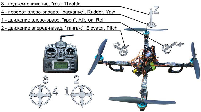 Квадрокоптер (будь это большая профессиональная модель или мини квадрокоптер) поднимается в воздух благодаря работе винтов, управляемых синхронными двигателями. Два пропеллера двигаются по часовой стрелке, два – против часовой стрелки. Координация направления и скорости движения квадрокоптера осуществляется с помощью пульта дистанционного управления. Команды передаются на приемник блока управления, а затем реализуются в виде усиления или ослабления мощности двигателей. При быстром вращении одного мотора квадрокоптер совершает наклон, при ускорении синхронной пары двигателей – поворачивается в нужную сторону.