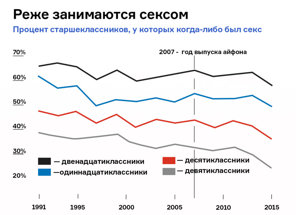 Кроме того, Твенге заметила, что нынешние старшеклассники реже заводят отношения и занимаются сексом.
