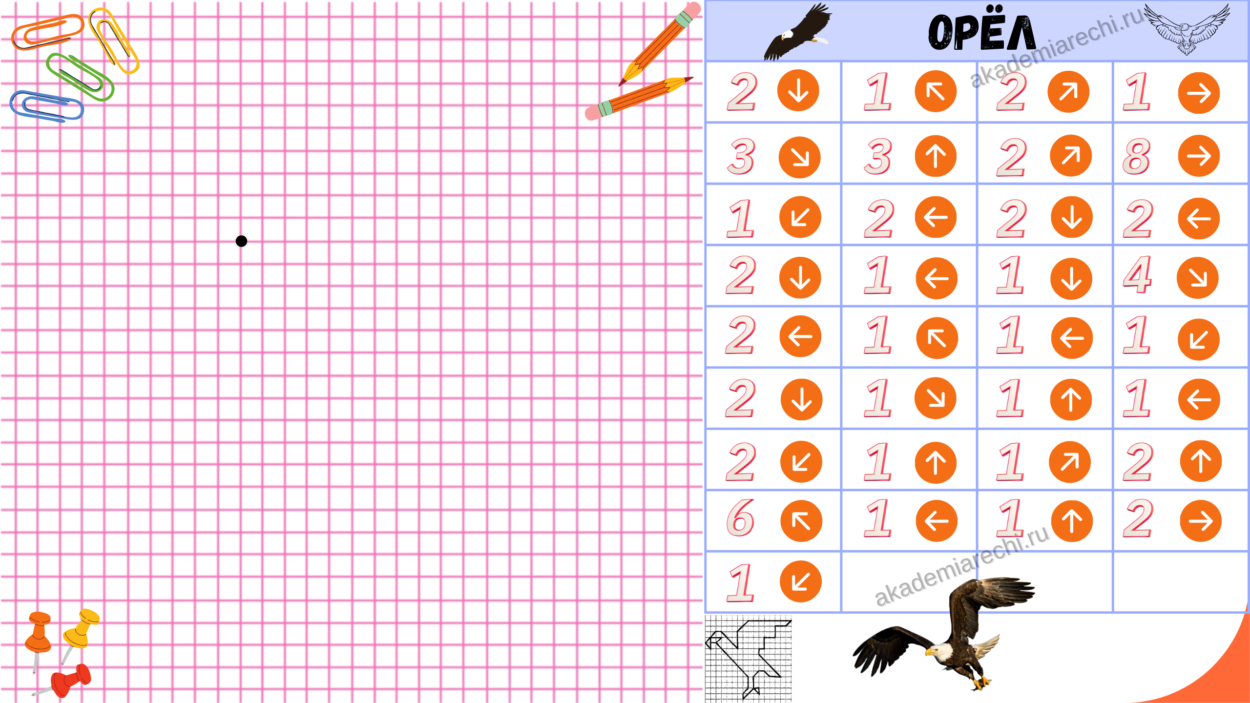 Педагог объясняет задание, и начинается «диктант». Нужно внимательно слушать поэтапную инструкцию и рисовать линии на несколько клеточек вверх, вправо, влево, вниз или по диагонали.