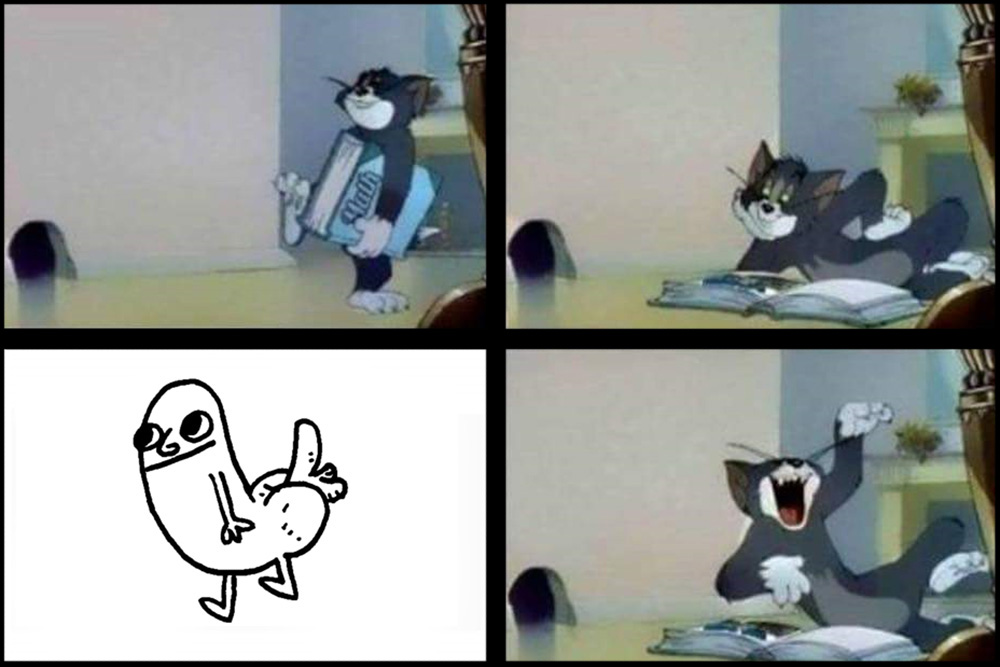 Джерри проглотил целый кусок сыра и принял его форму. Субъективно — один из самых смешных мемов по «Тому и Джерри», но и один из самых абстрактных. Зато и применений у него множество: можно шакалить картинку и писать вообще не связанные с ней фразы, можно шутить над перееданием или в сотый раз обыгрывать фразу: «Он съел сыр» — настоящий постмодернизм.